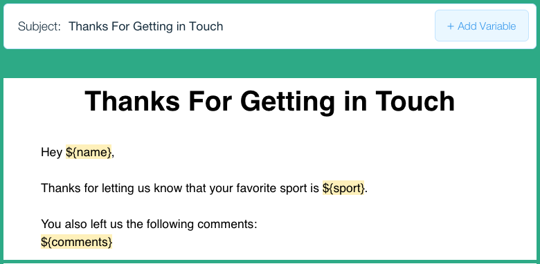 마지막으로, 양식이 성공적으로 제출되었을 때 위에서 설명한 트리거 이메일을 전송하는 코드를 작성합니다. 이 코드는 전자 메일 서식 파일의 변수 대신 사용할 양식의 값을 보냅니다.